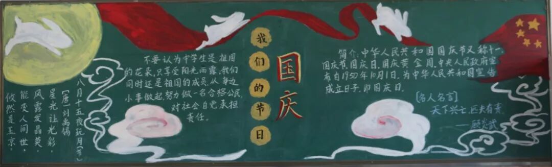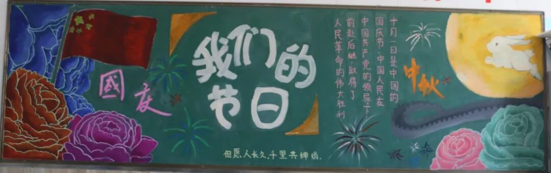为进一步弘扬中华优秀传统文化,加强爱国主义教育,增强庆祝中秋节和国庆节的浓厚氛围,美化学校文化环境,丰富校园文化生活,9月28日中午,陕西师大附中分校在初一、初二、高一叁个年级开展了以“迎中秋,庆国庆”为主题的黑板报评比活动。